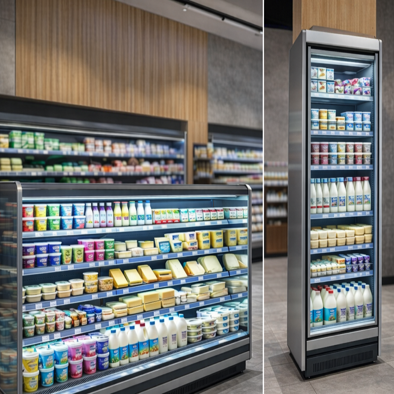 Sütlük ve duvar tipi soğutma reyonları, süt ve süt ürünlerinin doğru sıcaklıkta saklanarak müşterilere düzenli ve çekici bir şekilde sunulmasını