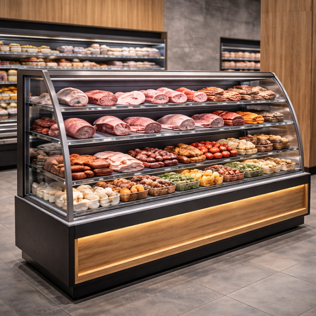 Şarküteri teşhir dolapları ve reyonları, et ürünleri, peynir çeşitleri, zeytinler ve diğer şarküteri ürünlerinin hem hijyenik hem de dikkat çekici