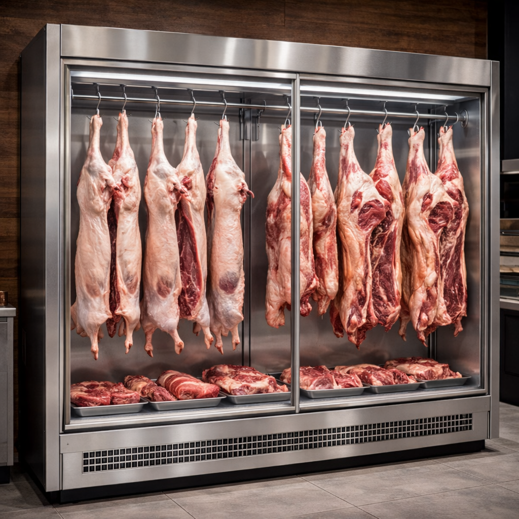 Et asma dolapları, kırmızı et ürünlerinin hijyenik koşullarda saklanması, dinlendirilmesi ve müşterilere estetik bir şekilde sunulması için özel olarak tasarlanmış